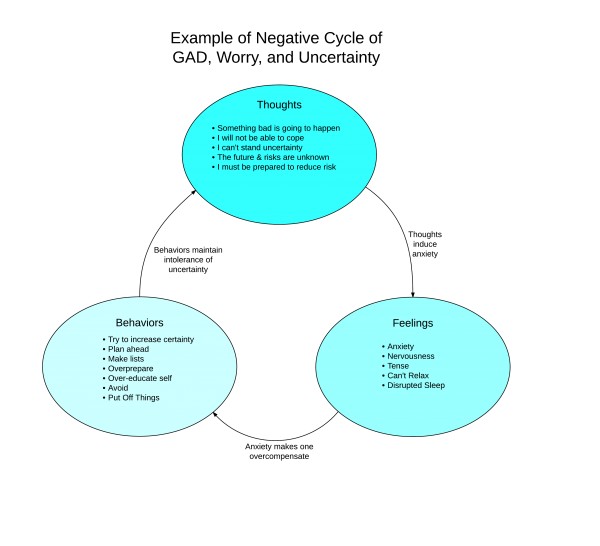 Uncertainty causes anxiety as people want to know and to be certain of things. And not being able to stand uncertainty makes you anxious. So when your intolerance of uncertainty triggers anxiety, then you take steps to decrease the uncertainty, such as making lists, planning ahead, overeducating yourself, and overpreparing. However, your attempts to decrease the uncertainty only serve to maintain your intolerance of uncertainty, and thus, the negative cycle of uncertainty continues, as illustrated in the following flowchart: