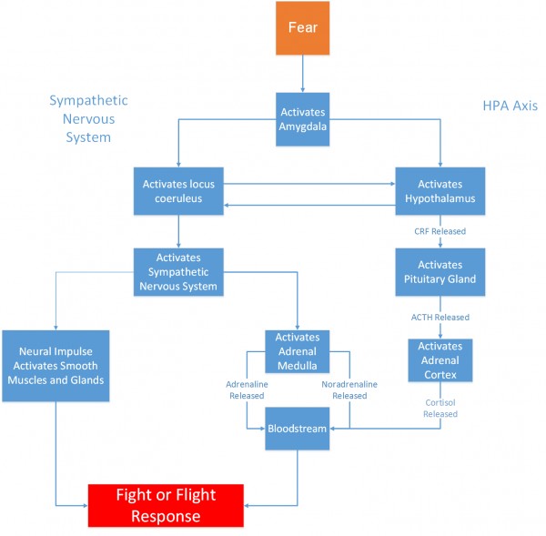 amygdala. A threat or stressor can trigger the amygdala, which then sets off the sympathetic nervous system and the HPA axis (hypothalamic-pituitary-adrenal), and this cascade of reactions is the fight or flight response. The following diagram outlines the fight or flight response: