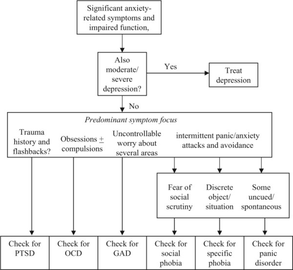 PTSD (post traumatic stress disorder) is diagnosed by a psychiatrist based on a clinical interview of the patient. An inventory of symptoms is gathered, and a flowchart of how the different anxiety disorders are diagnosed is illustrated here: