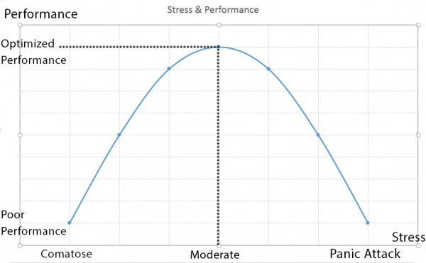 Actually, competitive anxiety is necessary for optimal performance. If you have no anxiety, then you perform poorly. By the same token, if you have too much anxiety, then you also perform poorly. However, if you have moderate amounts of anxiety, then it can push you to perform at peak levels. This relationship between anxiety and performance is illustrated by the following inverted U-curve: